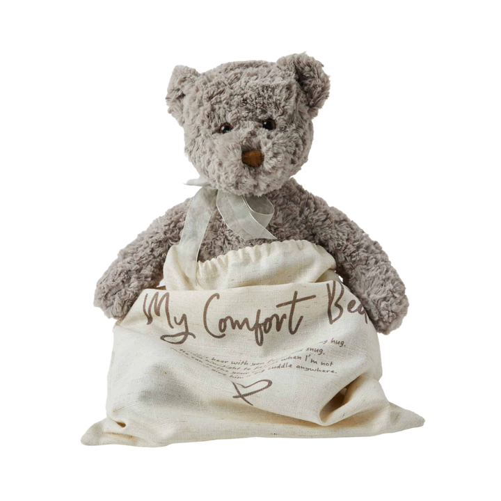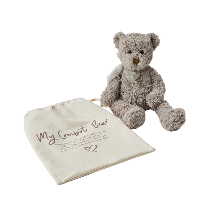 Darcy Bear comes with his own cotton travel pouch so he can accompany little one’s on life’s journey.