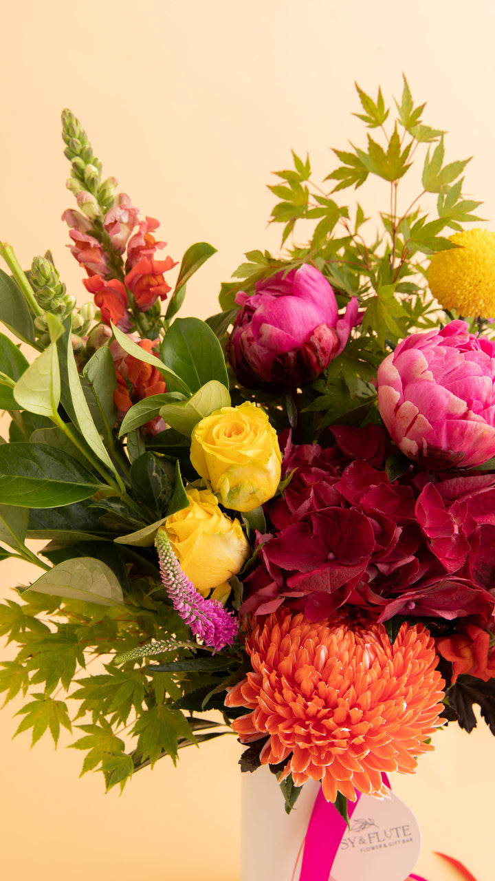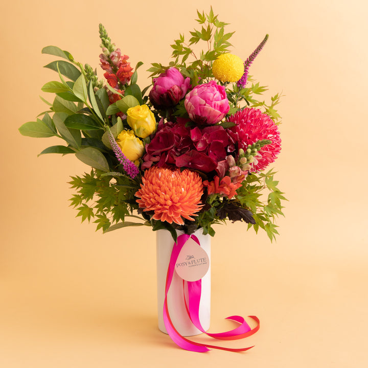 A beautiful radiant and vibrant mix of colourful blooms. Presented in our signature vase.
